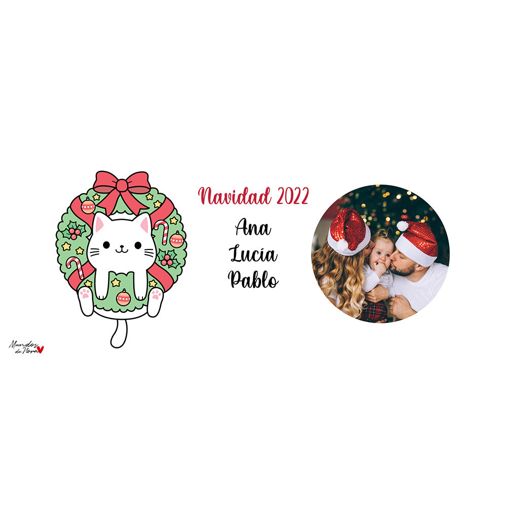 Esta taza con diseño de gato kawaii navideño es el regalo perfecto para recordar esos momentos mágicos a través de sus foto personalizada y añadir sus nombres.