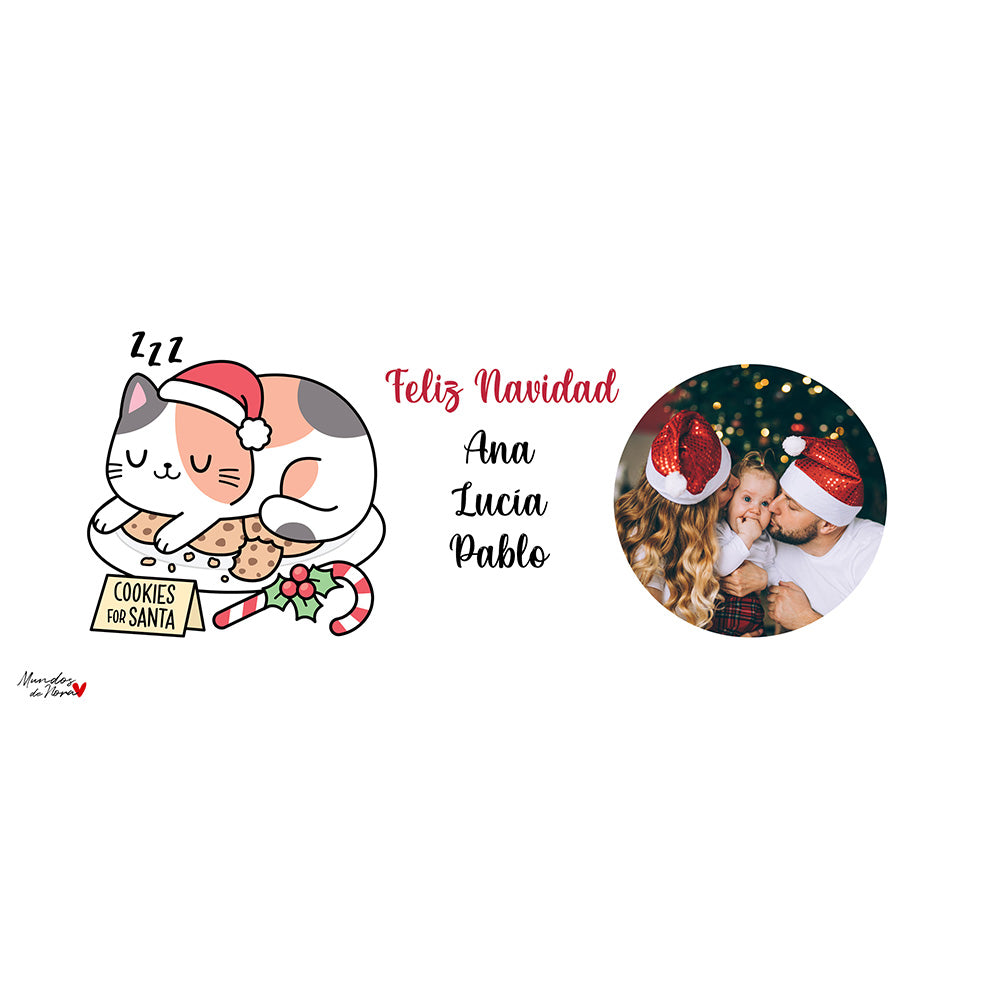 Esta taza con diseño de gato kawaii navideño es el regalo perfecto para recordar esos momentos mágicos a través de sus foto personalizada y añadir sus nombres.